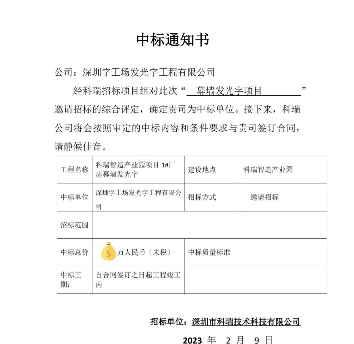 经科瑞招标项目组队此次“幕墙发光字项目”邀请招标的