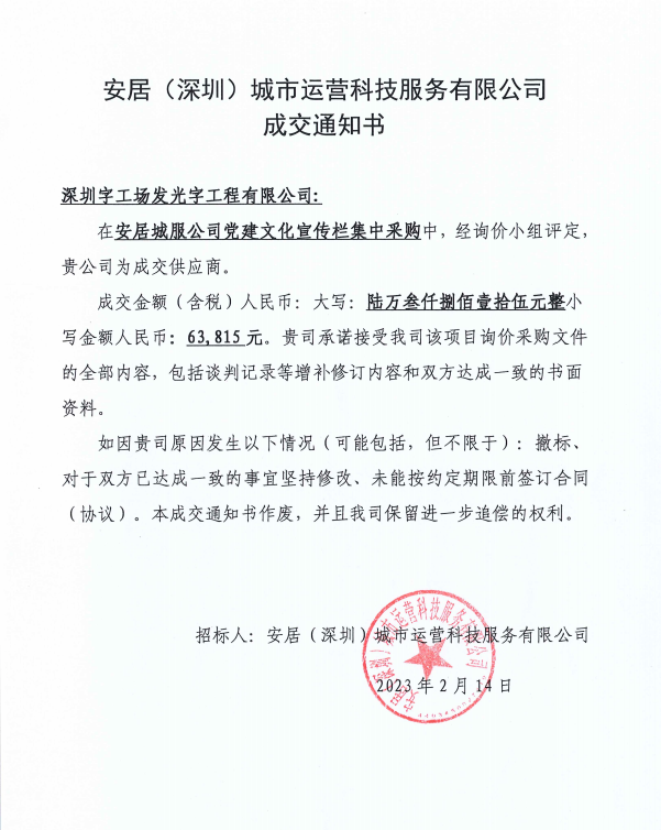 恭喜字工场中标安居(深圳)城市运营科技服务有限公司文化宣传栏制作安装项目