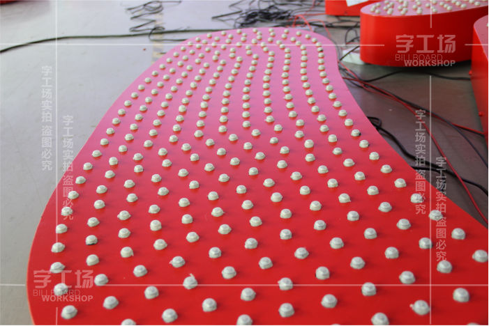 产品说明:该产品选用高品质铝板(1060H24) ,经过高精度电脑水刀切割或等离子切割、精密铝焊、精细打磨、LED灯点点阵排布等工序,使得该产品表面平整、侧边角度统一、焊接无痕且自身重量较轻、可选烤漆色彩丰富、LED灯点可选择单色(R\Y\B\G\W)或三色混光(即多色变化)。
