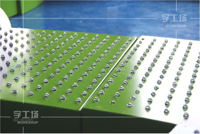 6)安装简单,维护方便:把LED用铆钉固定在冲孔工位上,LED冲孔发光字背面与钢架焊接一体成型,单人即可实现颜色更换和模组更换日常维护,从而大大降低了人工成本。