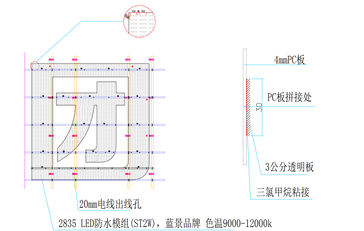 灯箱字主体分四块,正面包边面壳,正面透光面板,字体底盒,内部LED灯。