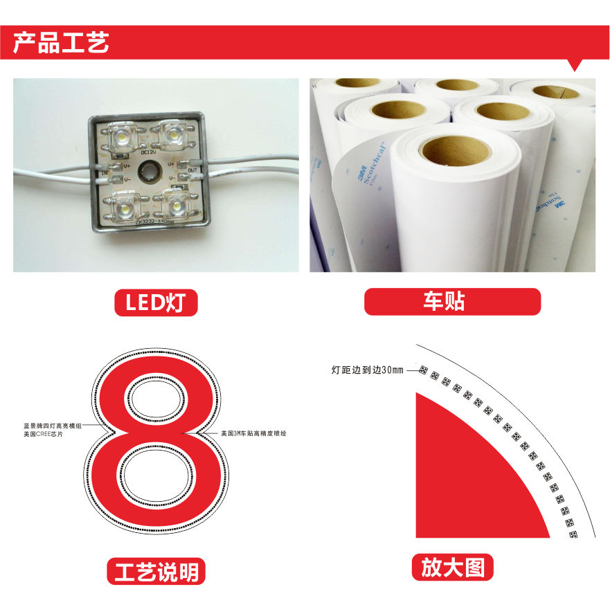 【制作材料及工艺】美国3M车贴进行高精度喷绘,周围贴蓝景牌的四灯高亮模组,模组到边的距离30MM。